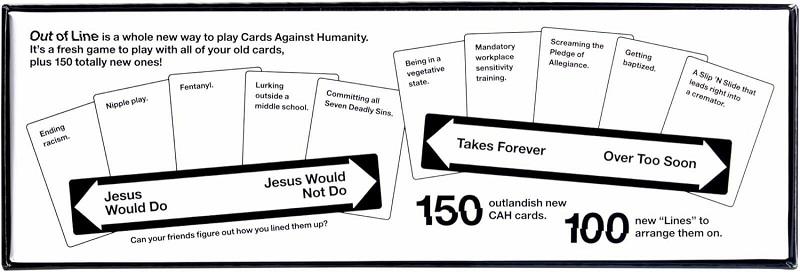 250 cards (150 outlandish new Cards Against Humanity cards and 100 new “Lines” to arrange them on