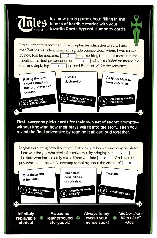 Tales is a new party game about filling in the blanks of horrible stories with your favourite Cards Against Humanity cards. First, everyone picks cards for their own set of secret prompts – without knowing how their plays will fit into the story. Then you reveal the final adventure by reading it all out loud together.