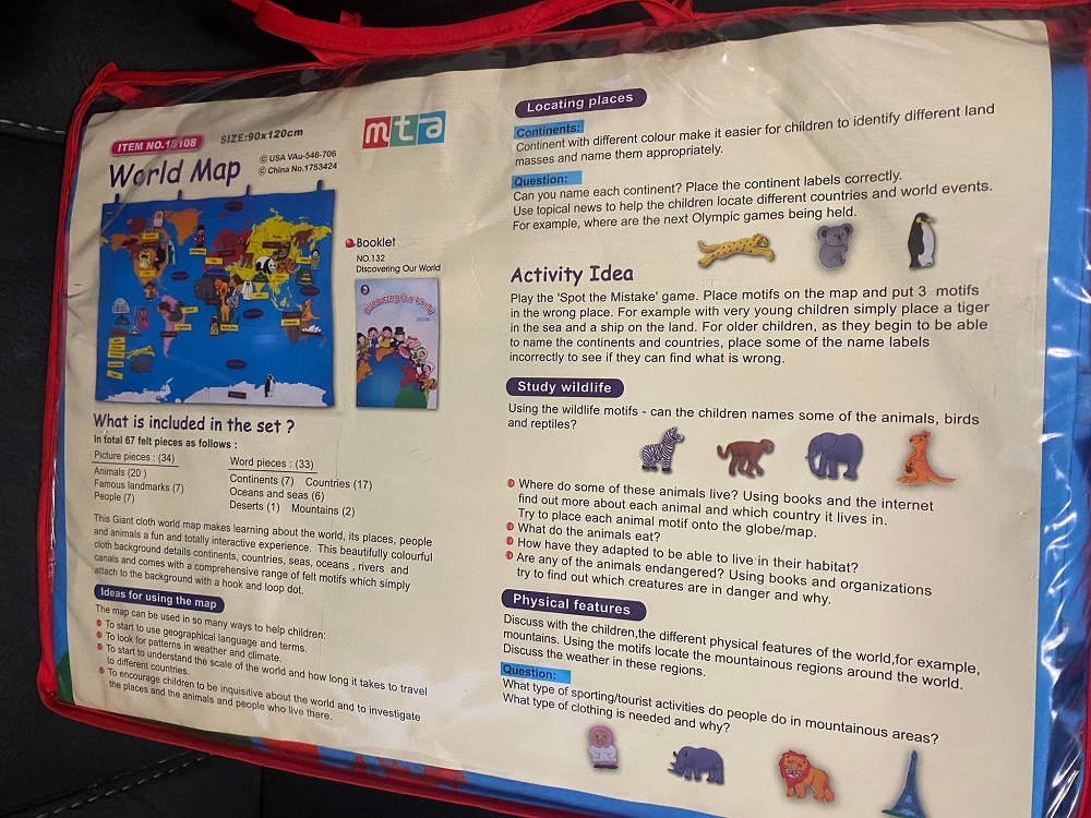 This large cloth wall chart of the world with 67 attachable pieces creates a fantastic resource for home, school or nursery.  It makes learning aout the world, the places, people and animals a fun and totally interactive experience.  This beautifully colourful cloth background deails continents, countries, seas, oceans, rivers and canals and comes with a comprehensive rance of felt motifs which simply attach to the background with a hook and loop dot.  A great resource for young children to begin to learn about the world.