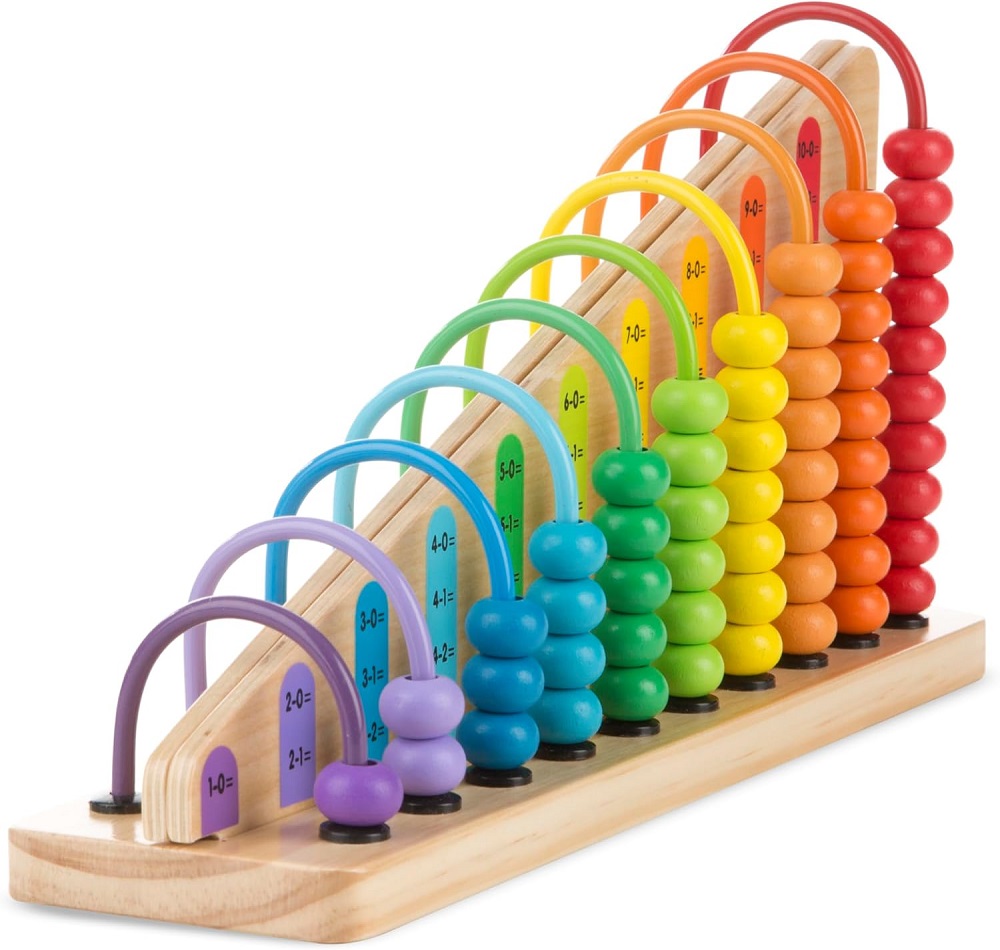 A wooden abacus that includes 55 colourful beads and 2 interchangeable double-sided wooden boards. The wooden boards feature addition and subtraction and colour matching, with bright colours and multiple ways to play for growing skill sets. Sturdy wooden construction. Encourages math skills, pattern and color recognition, fine motor skills, and hand-eye coordination.