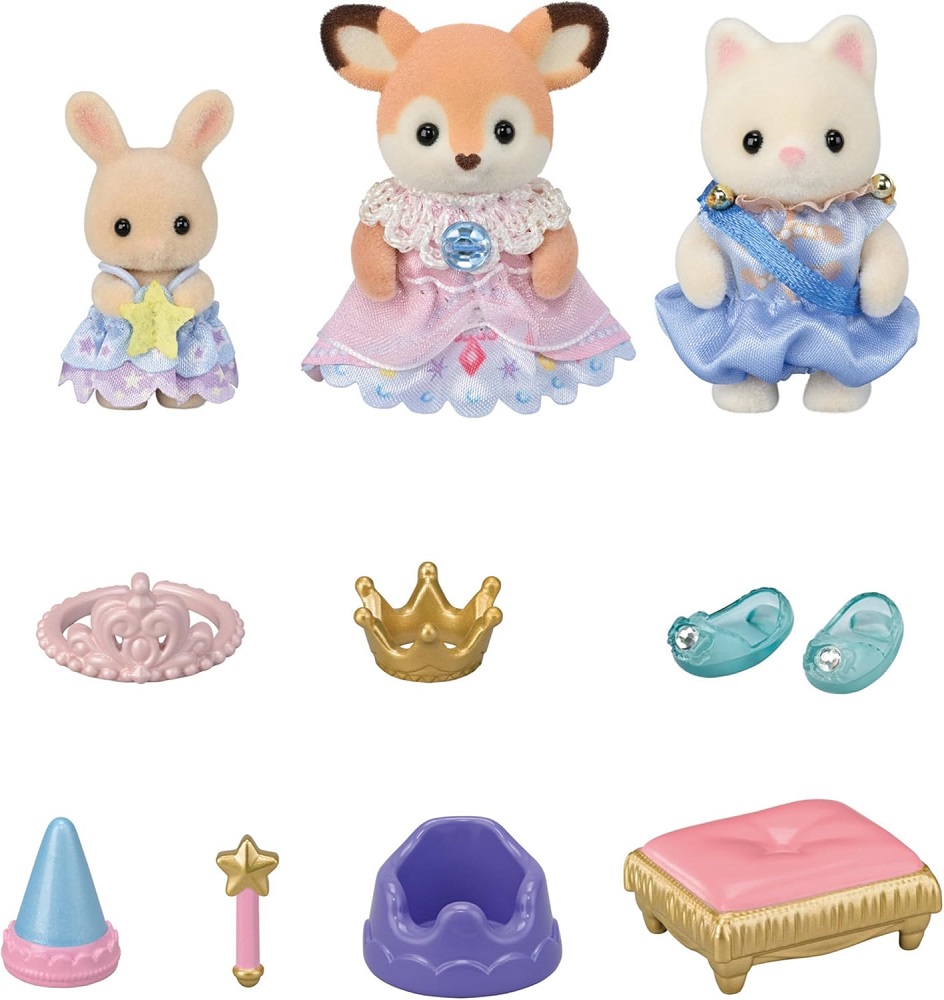 The Nursery Princess Play Set offers a magical role-play experience featuring three baby figures dressed as a princess deer, prince silk cat, and a witch milk rabbit. The set includes charming accessories such as glass slippers and a magic wand, fostering imaginative storytelling and fine motor skill development.