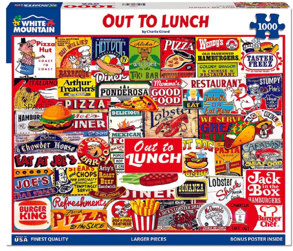 White Mountain puzzles are manufactured in the USA using premium blue chipboard with large pieces that interlock so well, that the completed puzzle can be picked up from the corners and stay together.  White Mountain puzzles make the largest standard 1000 piece jigsaw puzzles in the industry.