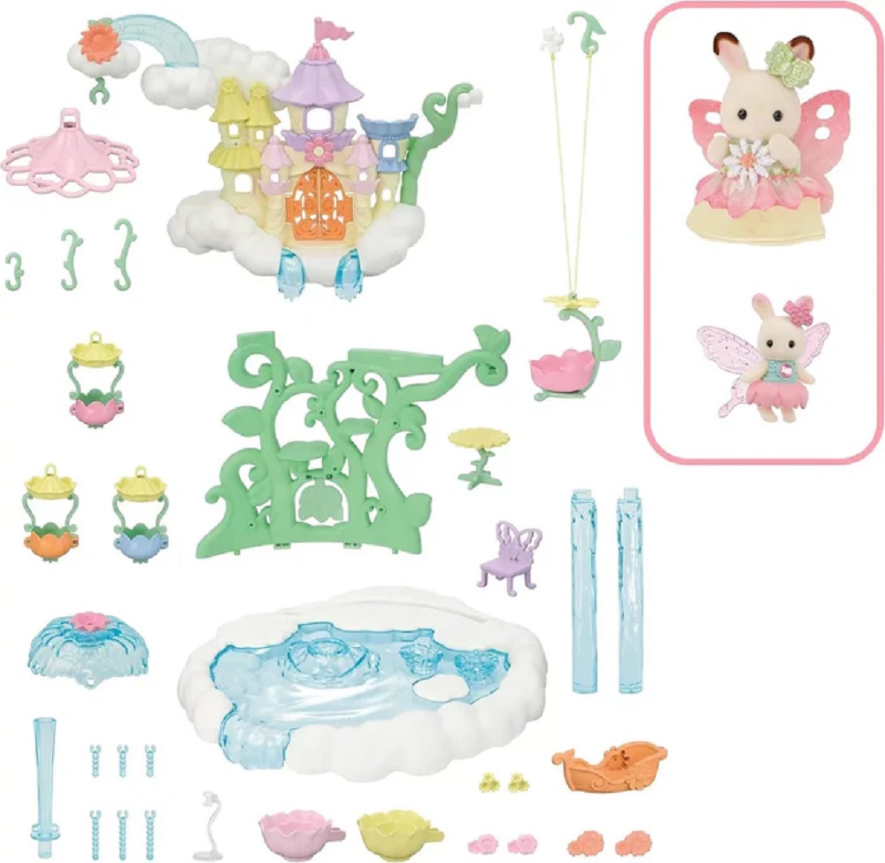 Includes Chocolate Rabbit Baby, Flower Fairy, butterfly earring, flower earring, Fairy Castle, lily of the valley, connecting part, rainbow, ivy, secret door, base, parasol, ivy (large), ivy (medium), ivy (small), gondola (pink), gondola (orange), gondola (blue), Floral Lift, waterfall A, waterfall B, fountain A, fountain B, droplet (large) x 3, droplet (small) x 3, flower cup (pink), flower cup (yellow), Leaf Boat, table, chair, lily x 2, camellia x 2, gerbera x 2, fairy stand A, fairy stand B, fairy stand C .